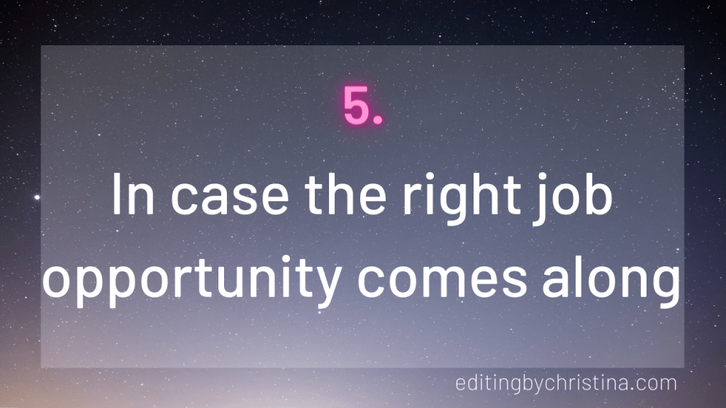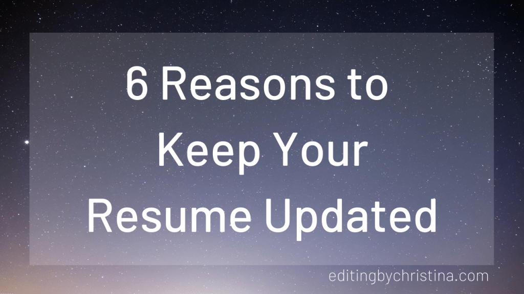 You may be wondering “Why should I update my resume? I already have a job…” There are many reasons to keep your resume updated. In the article below, I go over 6 reasons why you should have your resume up-to-date that don’t involve job hunting! Check it out! After you finish reading the reasons and are interested in revamping your resume, contact edtingbychristina@gmail.com or check out editingbychristina.com