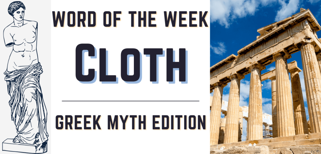 Cloth is one of the many words in the English language that has its roots in Greek mythology. In this case, the word cloth derives from Clotho, one of the three Fate sisters. The Fates are the controllers of destiny and composed of Clotho—spins the thread of human life, Lachesis—measures the thread of human life, and Atropos—cuts the thread. As the spinner of yarn, Clothos is in charge of controlling when people are born and when people are brought back to life by how she spins her thread.