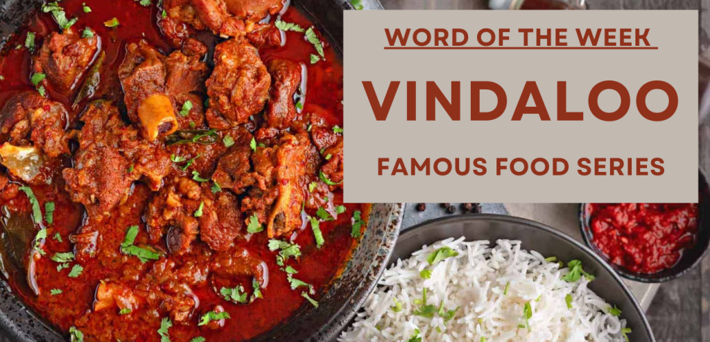 Vindaloo is a noun and is defined as a curried dish of Indian origin made with meat or shellfish, garlic, and wine or vinegar. Introduced by Portuguese explorers in the early-1400’s, vindaloo became a popular dish in the India region of Goa. This dish was based on the popular Portuguese dish carne de vinho e alhos or meat with wine and garlic, and the word vindaloo comes from the mispronunciation of the Portuguese words vinho e alhos. During the 1800’s, the dish became popular in Britain and is now a common dish worldwide.